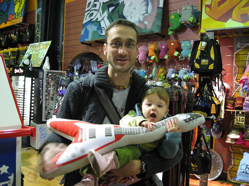 Comme je suis déjà allé à New York j’avais une boutique en tête que je savais qu’Amélie aimerait « The Yellow Rat Bastard » ou quelque chose comme ça. Effectivement elle en est ressortie avec 2 jolies T-shirts. Noémie a joué de la guitare en attendant sa mère. Elle est bien patiente notre Noémie, elle tient surement ca de son arrière grand-père paternel, de son grand-père et de son père.